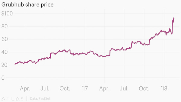 That is the two-year stock chart for Grubhub and I would say they are doing alright. The stock jumped again last week after Grubhub beat on earnings, partnered with Yum Brands to deliver exclusively from Taco Bell, KFC, and Pizza Hut, and won its employment classification lawsuit.