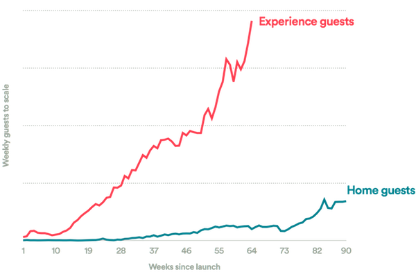 This chart is supposedly the absolute number of weekly guests in the first year or so after Experiences launched compared to the same timeline for Airbnb's original home-sharing business. The point, in case you couldn't tell from the sharp upward swing of the bright red line, is to show that Experiences is growing much faster than home-sharing did when it launched in August 2009. The unlabeled red-blue line chart, by the way, is a startup favorite, and you should absolutely always trust it.