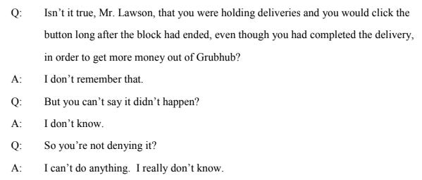The court found this unconvincing ("Mr. Lawson’s claimed ignorance of his dishonest conduct is not credible"). It also came out at the trial that Lawson lied on a Grubhub application in April 2017, claiming he had never worked for Grubhub before, and entering an alias ("Ray Lawson") and different email. You would think in all the Grubhub workers across the country there would be someone with a cleaner record the attorneys could have found for this case. But for whatever reason Ray, I mean Raef, Lawson was the guy.