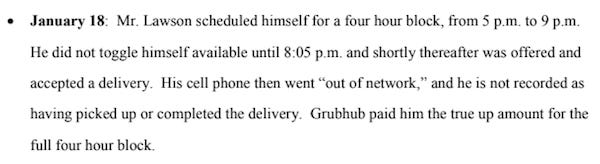 A ruling in the other direction could have had serious consequences for Grubhub's business model, as anyone familiar with the big Uber class-action on employment classification will recall. Independent contractors don't get benefits or a guaranteed minimum wage, making them up to 30% cheaper to hire. There is a good argument to be made for why people in these jobs might be considered employees rather than contractors, but Lawson was a uniquely terrible plaintiff. He was fired by Grubhub (and also Postmates) for breaching its terms of service by gaming the app to earn money for time he didn't actually work. For instance: