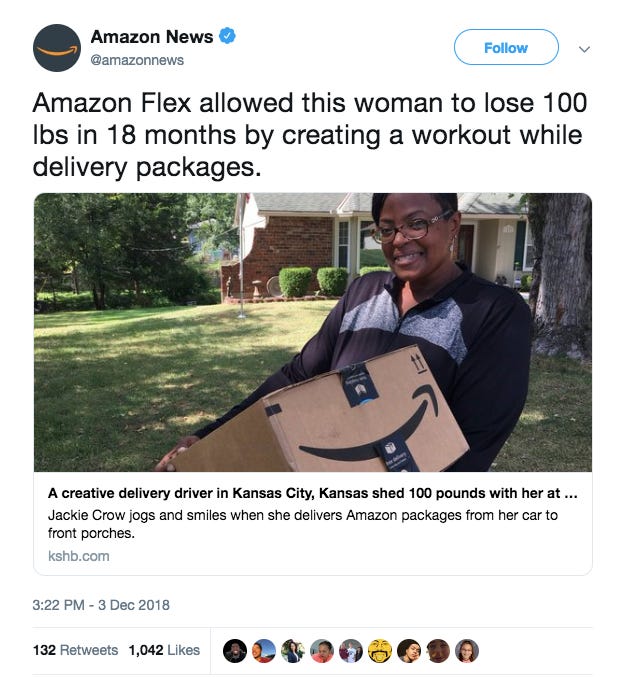 The linked article is “Creative delivery driver in KCK sheds 100 pounds with her at work, work-out.” The lead is “Jackie Crow jogs and smiles when she delivers Amazon packages from her car to front porches.” Crow, the article explains, decided to make her job a workout three years ago, when she weighed 300 pounds and was diagnosed with rheumatoid arthritis. She decided to change her diet and become more active. “I don't want to be in an office... and Amazon was the missing piece that I needed to stay active,” she told KSHB. She lost 100 pounds in 18 months. Inspirational story or Black Mirror Episode? You be the judge! (It was, in fact, the premise of a 2015 segment in Comedy Central’s Nathan For You.)