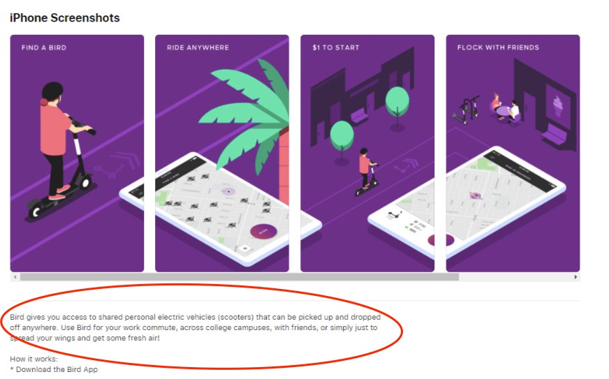 The crux of Lautemann’s allegations is that Bird is “prioritizes users’ convenience over property owners’ rights,” with a policy that encourages Bird users to pick up and drop off their scooter “anywhere.” The complaint includes a screenshot of the Bird app in Apple’s app store that advertises this policy, which I’ve circled in red below: