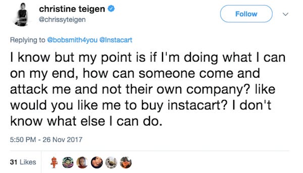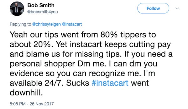 Anyway, some Instacart shoppers threatened to strike again this Thanksgiving, over tips and wages that, they alleged, could fall as low as $1 an hour. A few days after the holiday, Twitter user Bob Smith ("@bobsmith4you") decided to explain the situation directly to model and social media celeb Chrissy Teigen:
